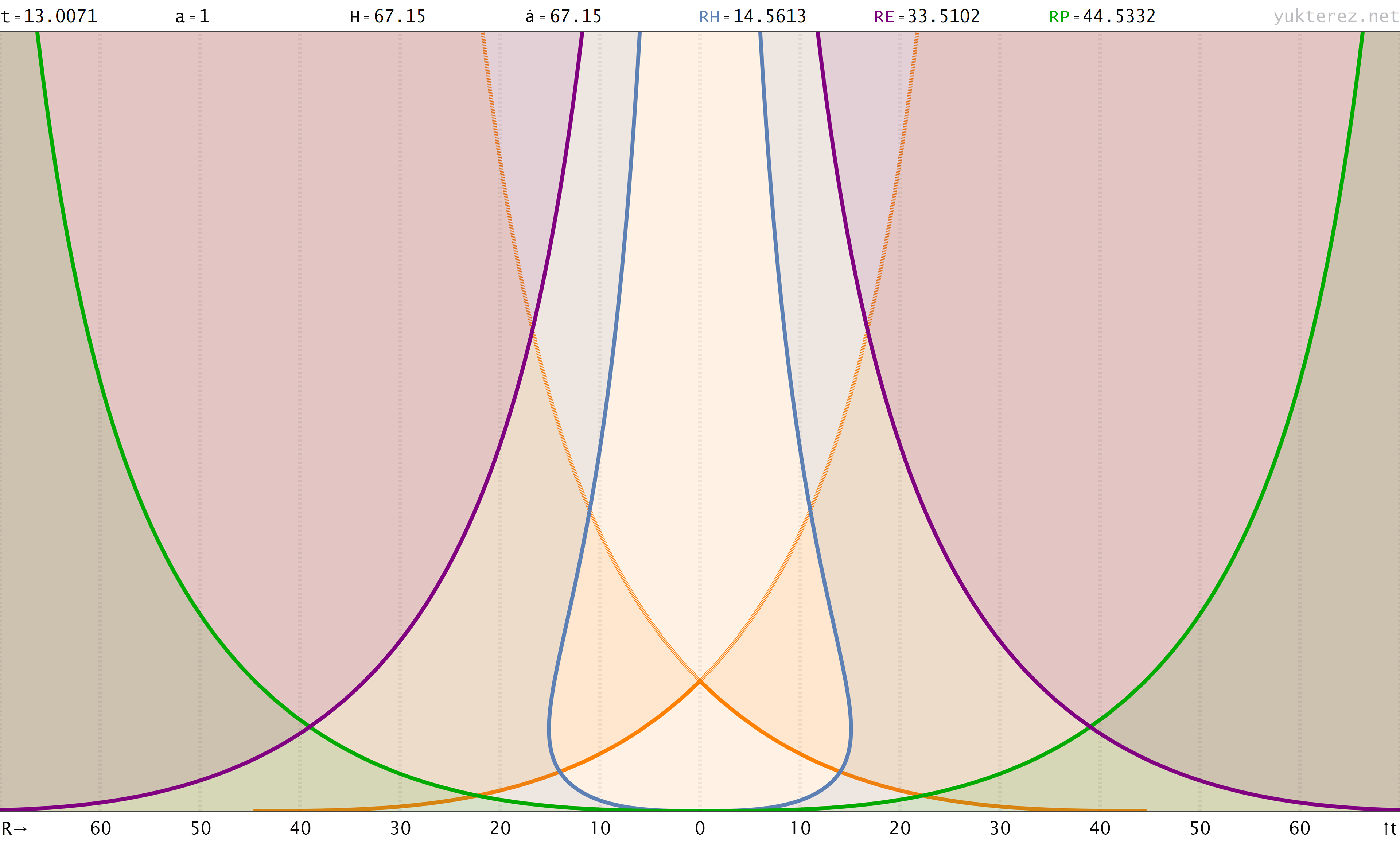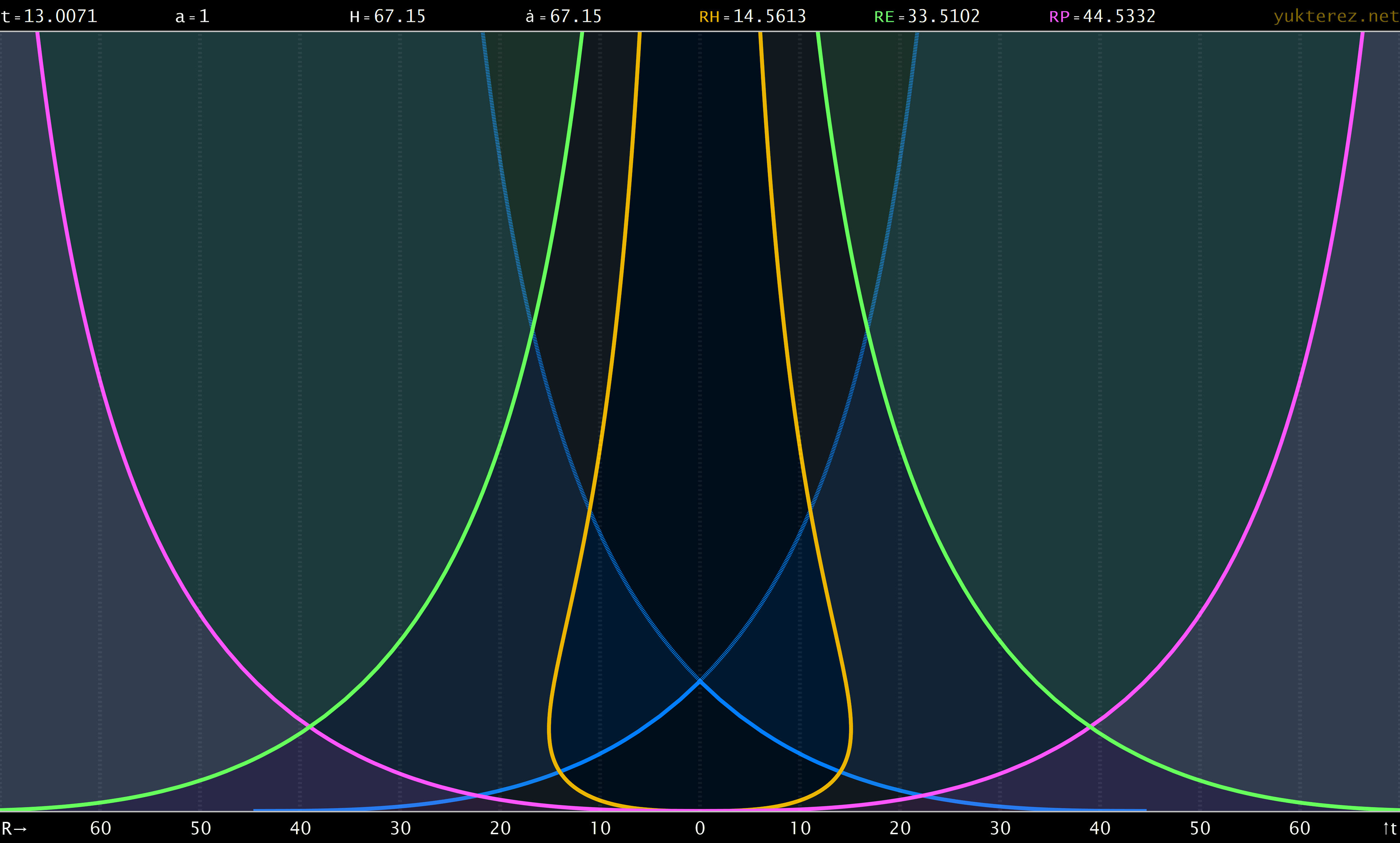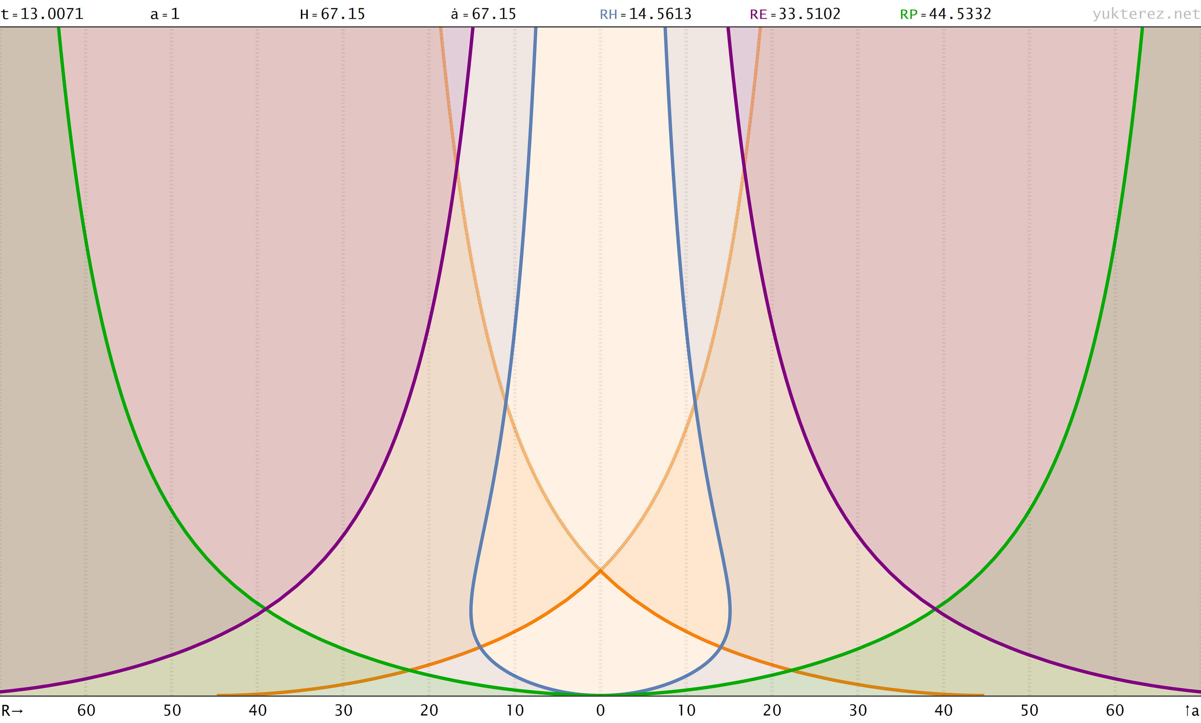 Proper (r) & comoving (R), Plot range: r|R=0…70, a=0…5.38, t|η=0…78.35