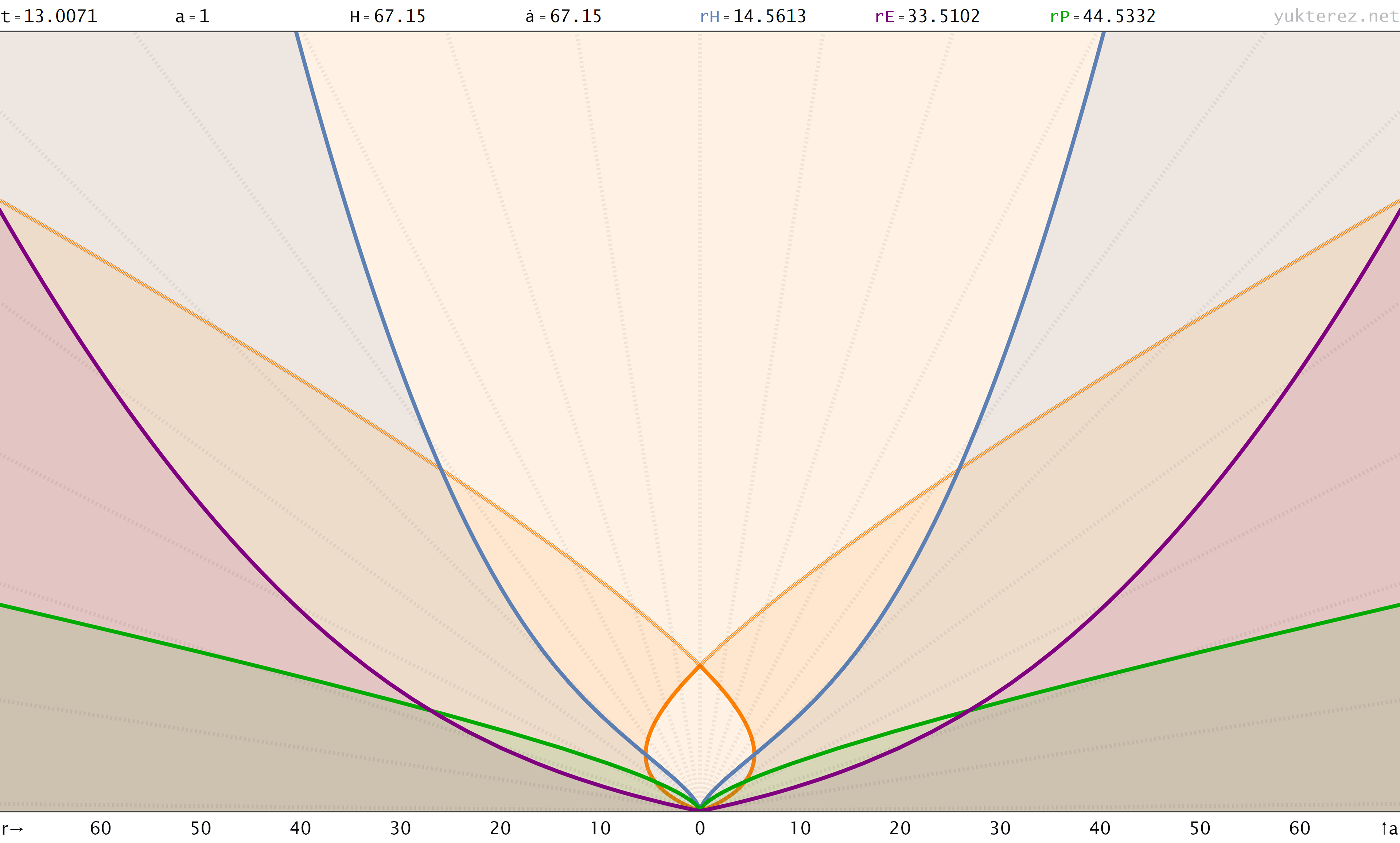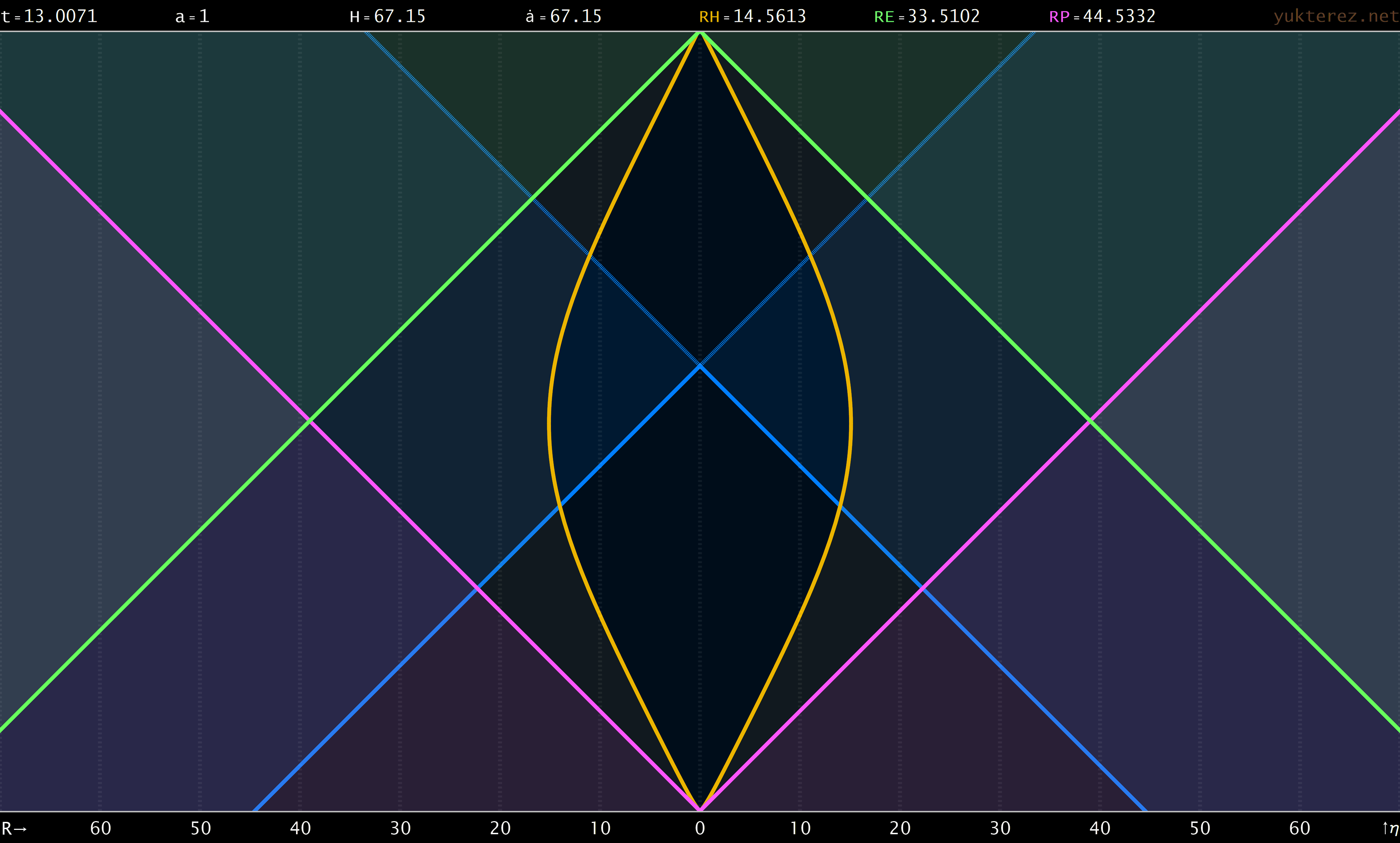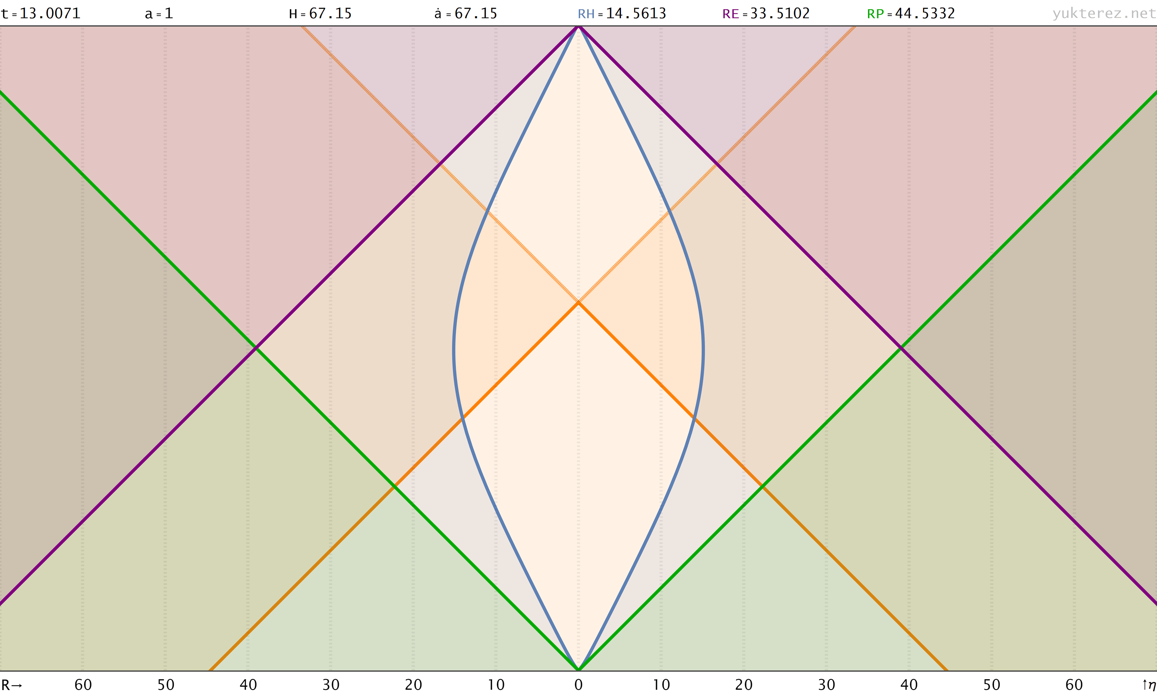 Color code: Hubble radius, Event horizon, Particle horizon, Light cone