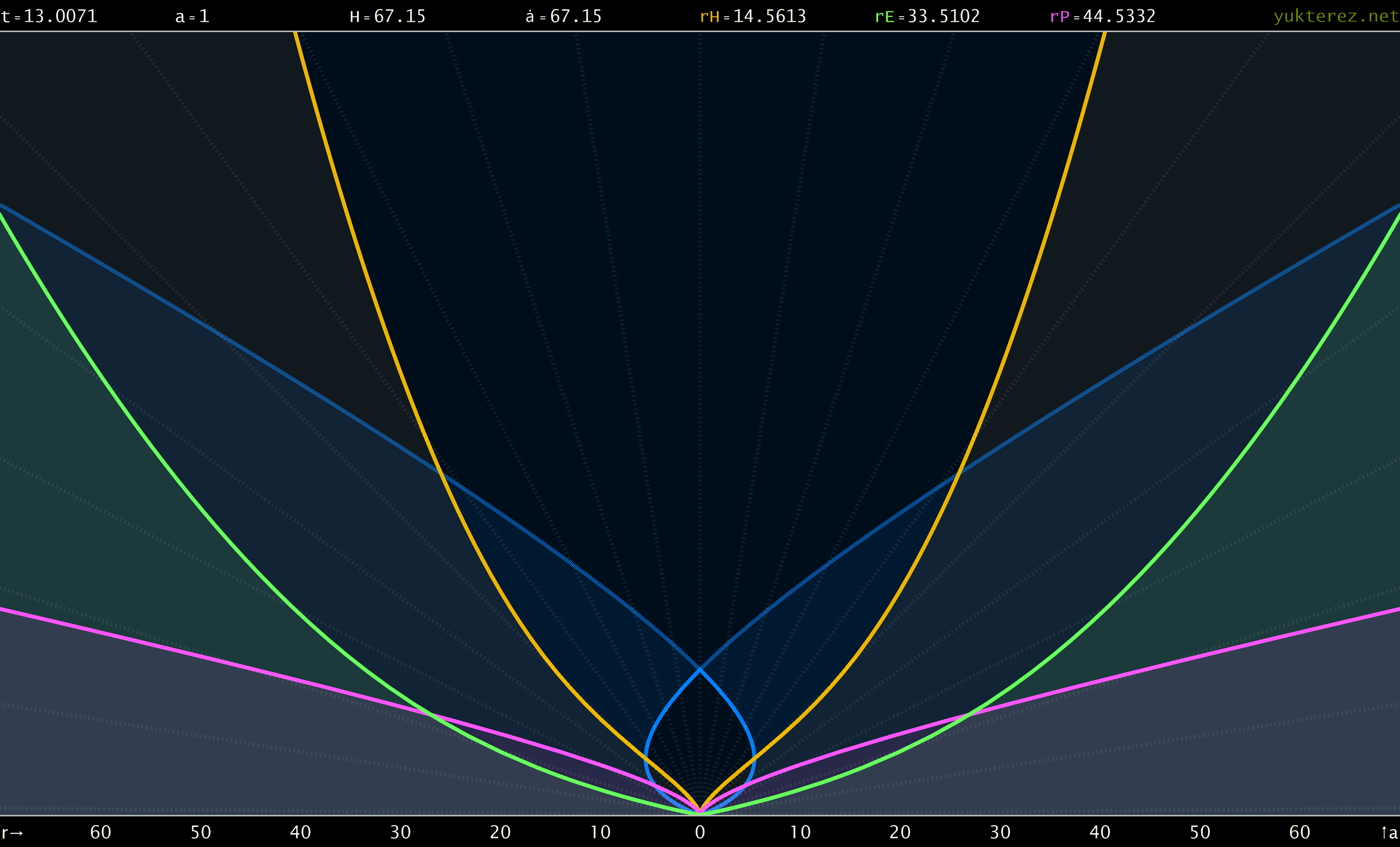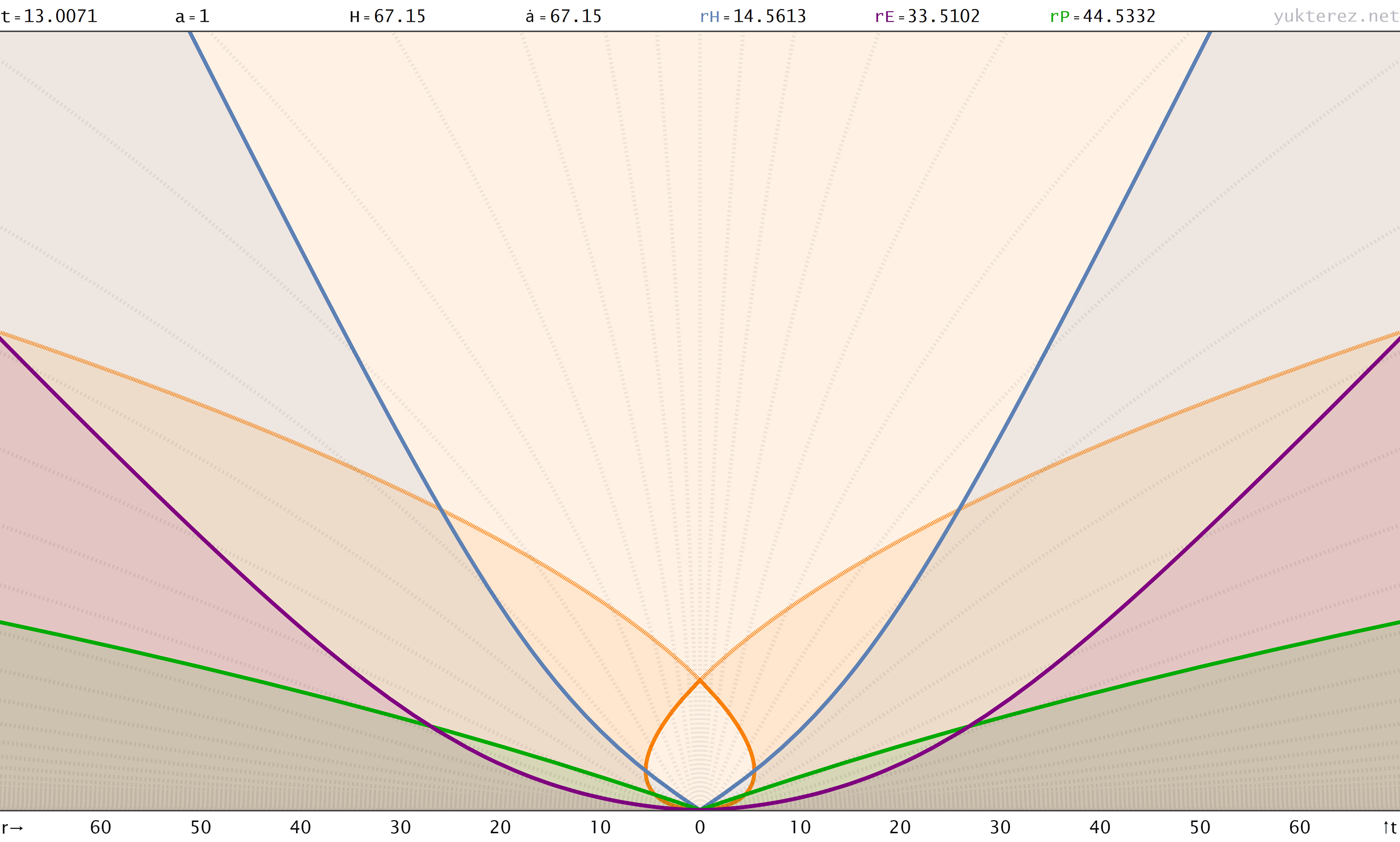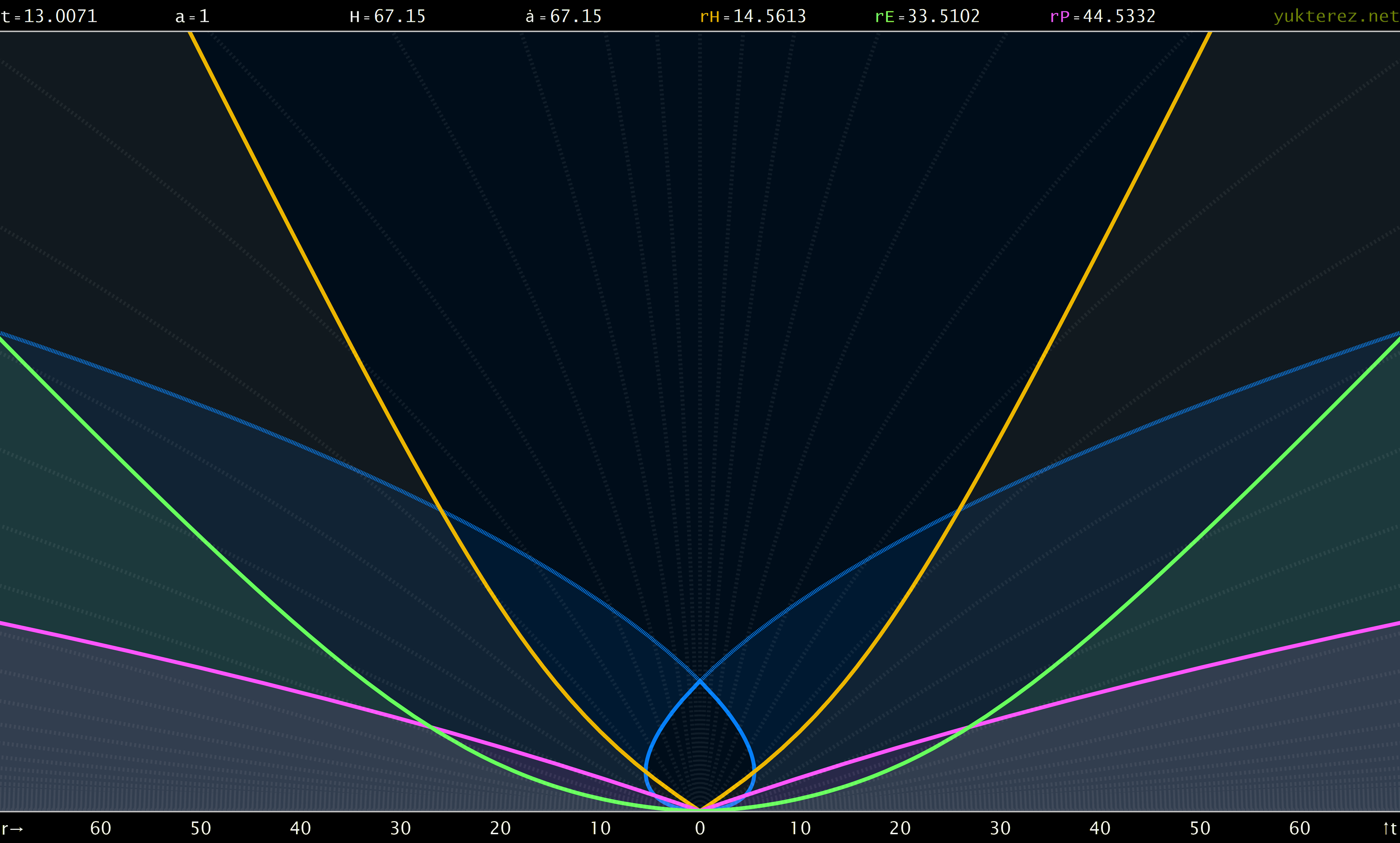 Color code: Hubble radius, Event horizon, Particle horizon, Light cone